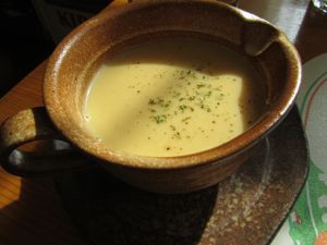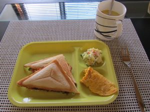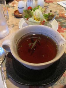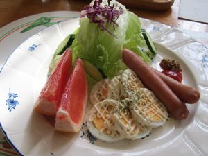 スープ、サラダ、ソーセージ、卵、パンがついてました。