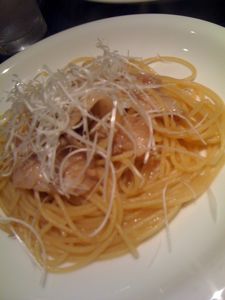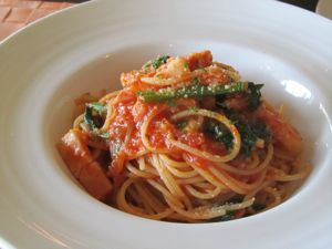 パスタは王道のベーコンと法蓮草のトマトソース。
