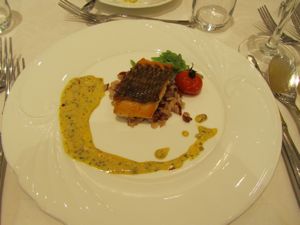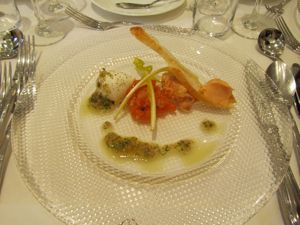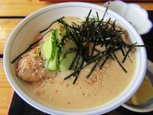 ポークソテーの上にやまいもとキュウリの浅漬けが