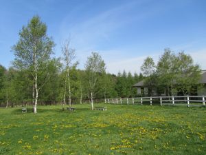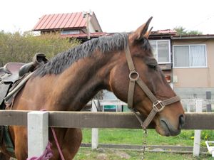 牧場が近く似合って、優しい目をした馬がお出迎え。