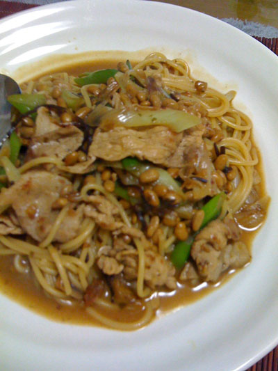 見た目悪いけど、豚肉とねぎと納豆のパスタ