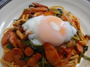 ほうれん草とソーセージトマトパスタwith 温卵作ったり・・・
